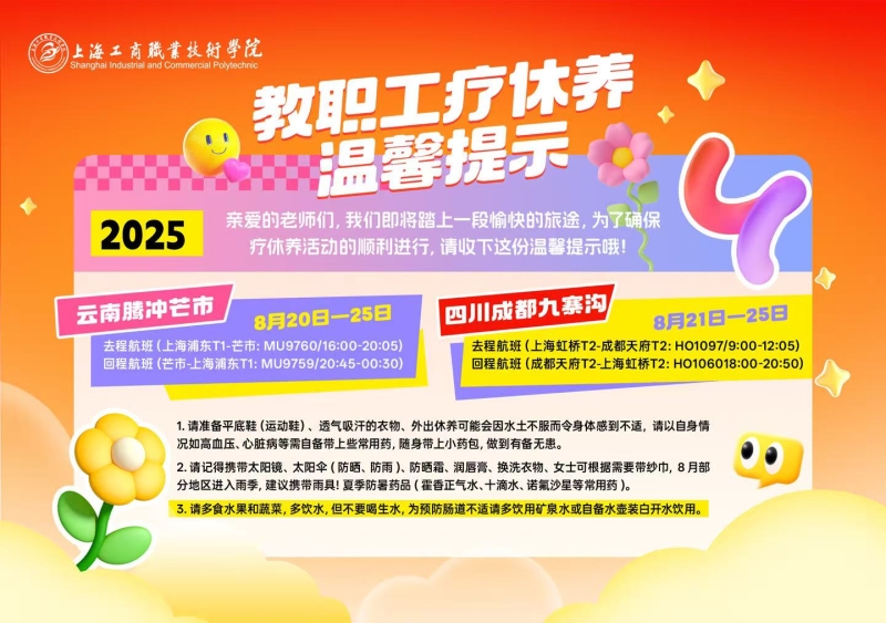 疗休养工作自启动以来,受到了全体教职工高度关注和学校党政的高度重视。5月下旬,在接到上海市教育工会《关于2025年教职工疗休养的通知》后,校工会迅速启动疗休养工作。5月27日,组织召开疗休养领导小组召开专题会议,研究制定疗休养方案,并于5月27至6月4日陆续完成了报名、资格审核、组团、调整团员等工作,最终组织了云南芒市、四川九寨沟等2条线路,共2个休养团。
