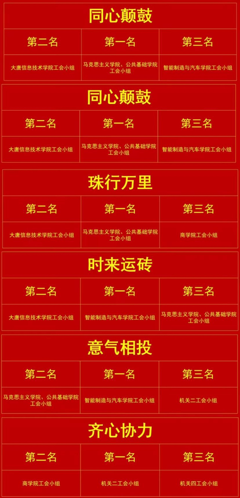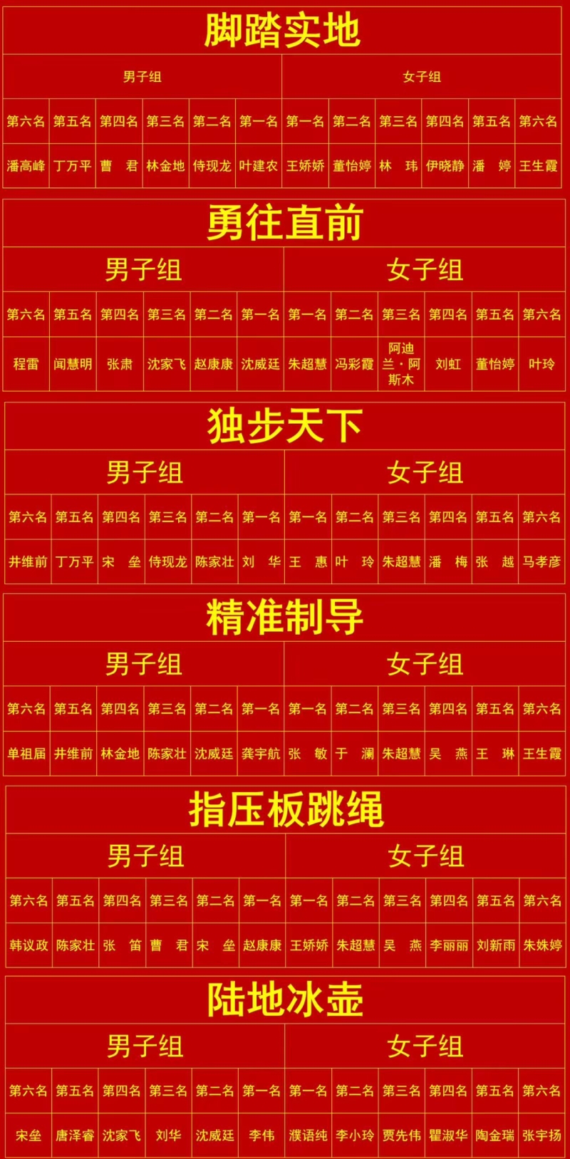 根据个人项目、团体项目获奖情况评选出团体一二三等奖6个;根据参与率评选出优秀组织奖1个,名单如下: