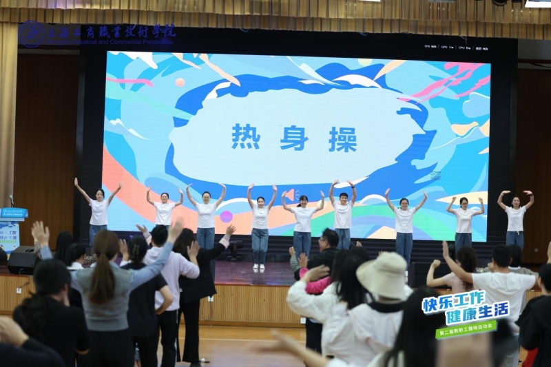 全体教职工在上海职工健身操(工间操)参赛代表队的带领下齐跳热身操,为即将到来的比赛做好准备。