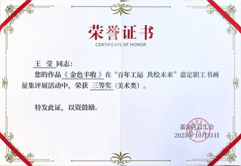 嘉音传喜讯,翰墨寄深情。在10月31日上午隆重举办的“百年工运 共绘未来”嘉定职工书画征集评展活动中,我校教职工王莹凭借其精湛的创作技艺和深厚的艺术造诣,在众多参赛作品中脱颖而出,荣获美术类三等奖。